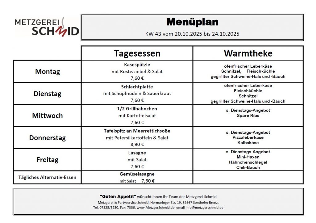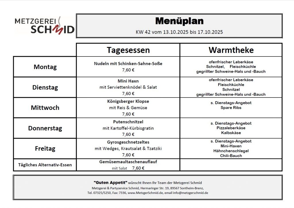 Schauen Sie doch in Ihrer Mittagspause bei uns vorbei und lassen sich unseren täglich wechselnden Mittagstisch schmecken. Regionale Spezialitäten werden täglich für Sie frisch gekocht. Haben Sie es eilig, dann bestellen Sie einfach Ihr Essen vor, damit es bei der Abholung für Sie bereitsteht.